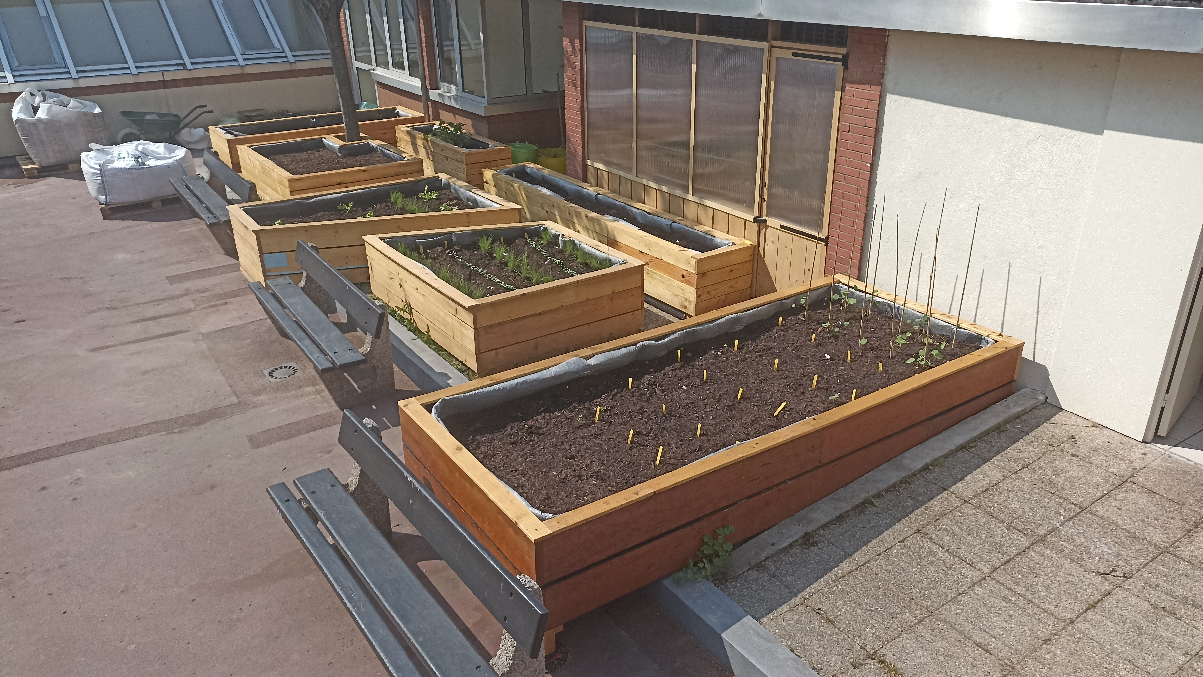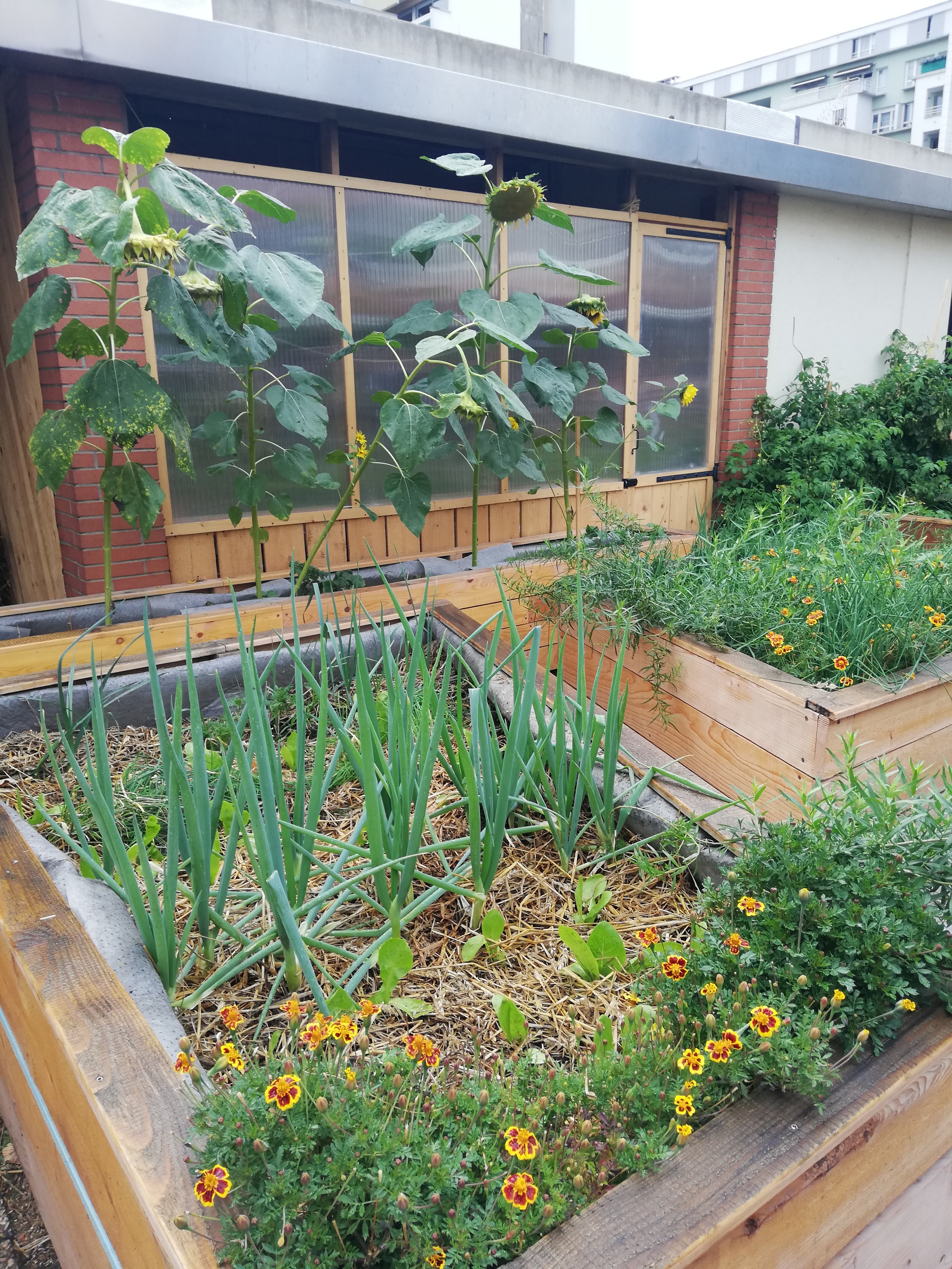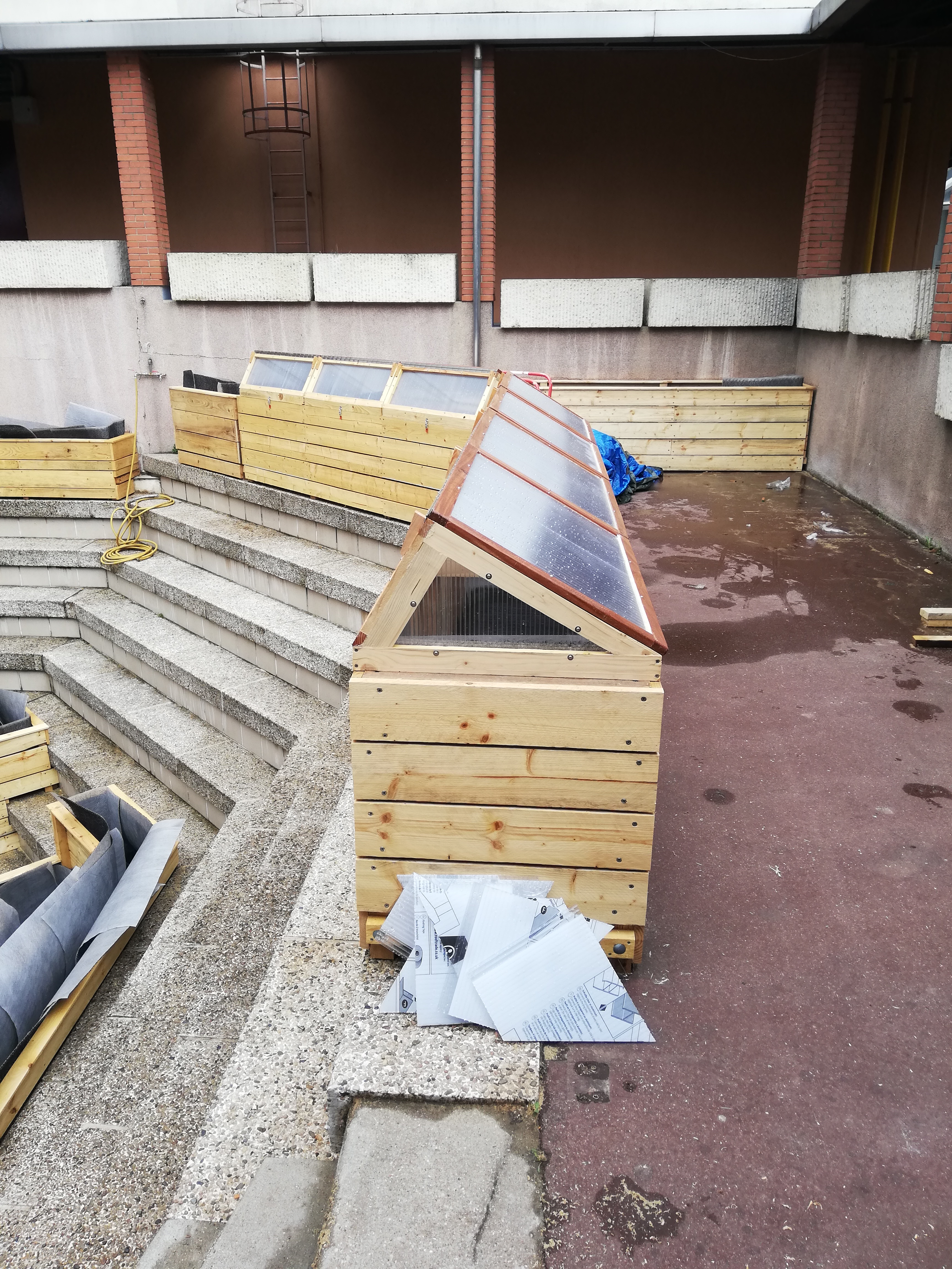 Dans le cadre de l’appel à projet des Pariculteurs, le collectif missioné par l’association Croque Ta Ville a réalisé 200m2 de surfaces cultivables hors-sol, 9 mini-serres à semis et un local de stockage pour le matériel de jardinage dans le but d’aménager la cour et l’amphithéâtre extérieur de l’école de cuisine du CEPROC. Le projet a été réalisé intégralement sur mesure avec ¾ de bois issu du réemploi.