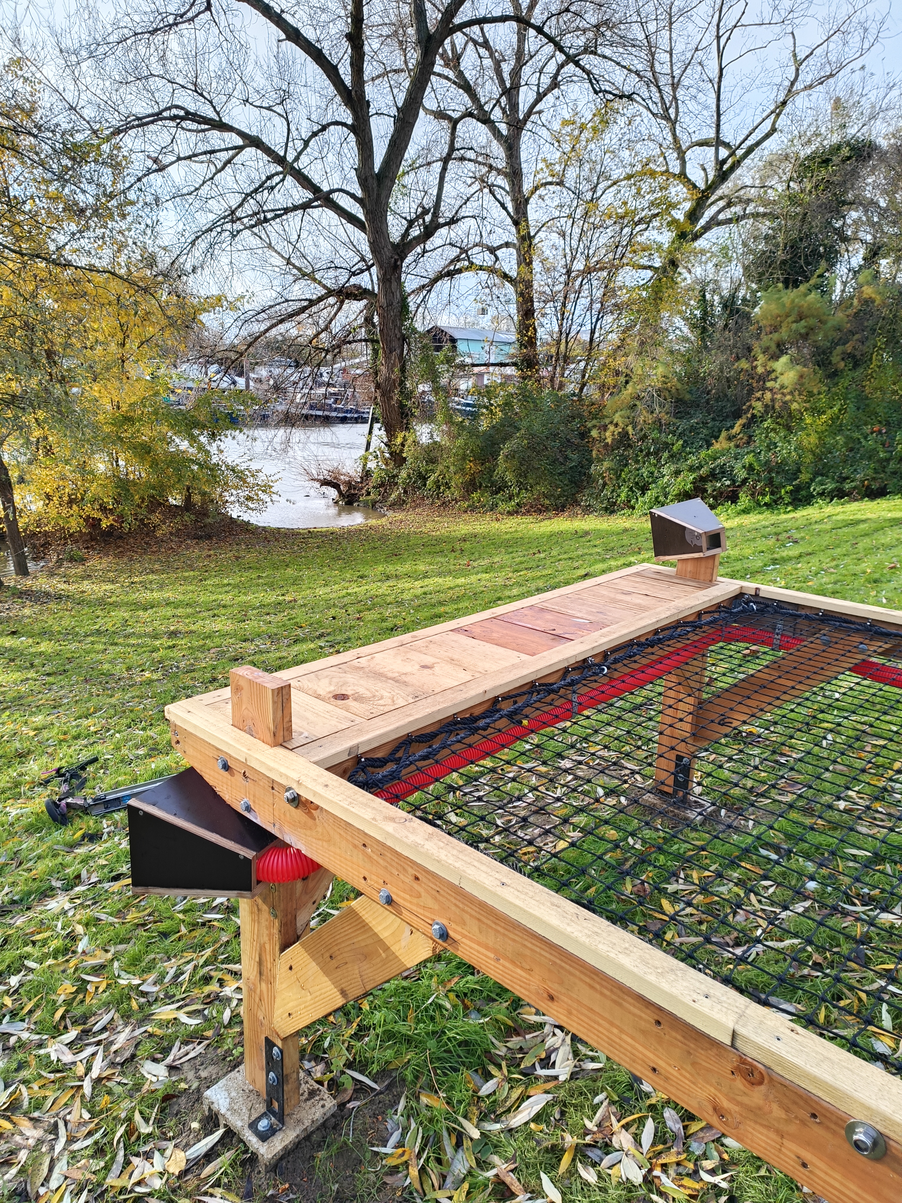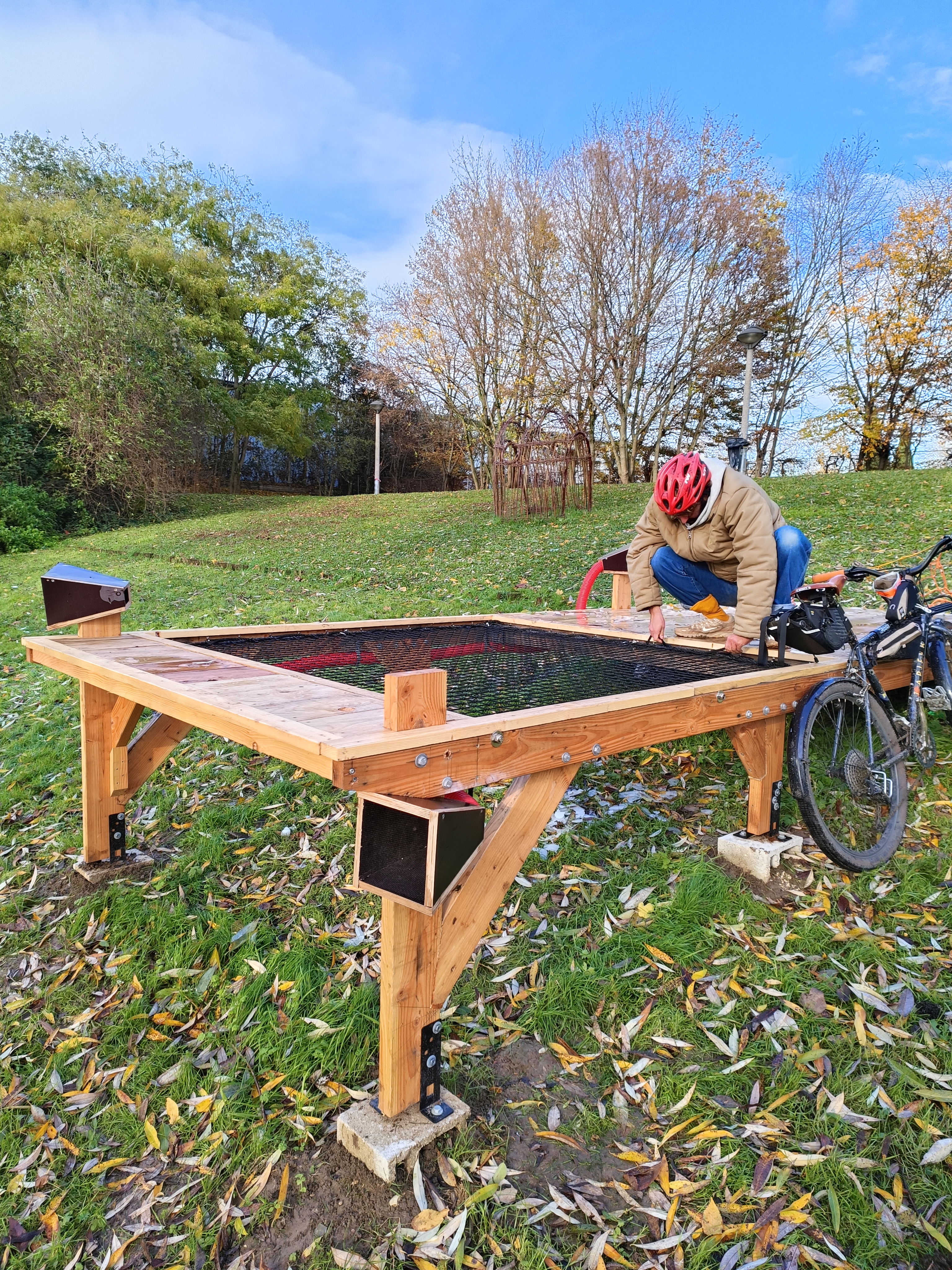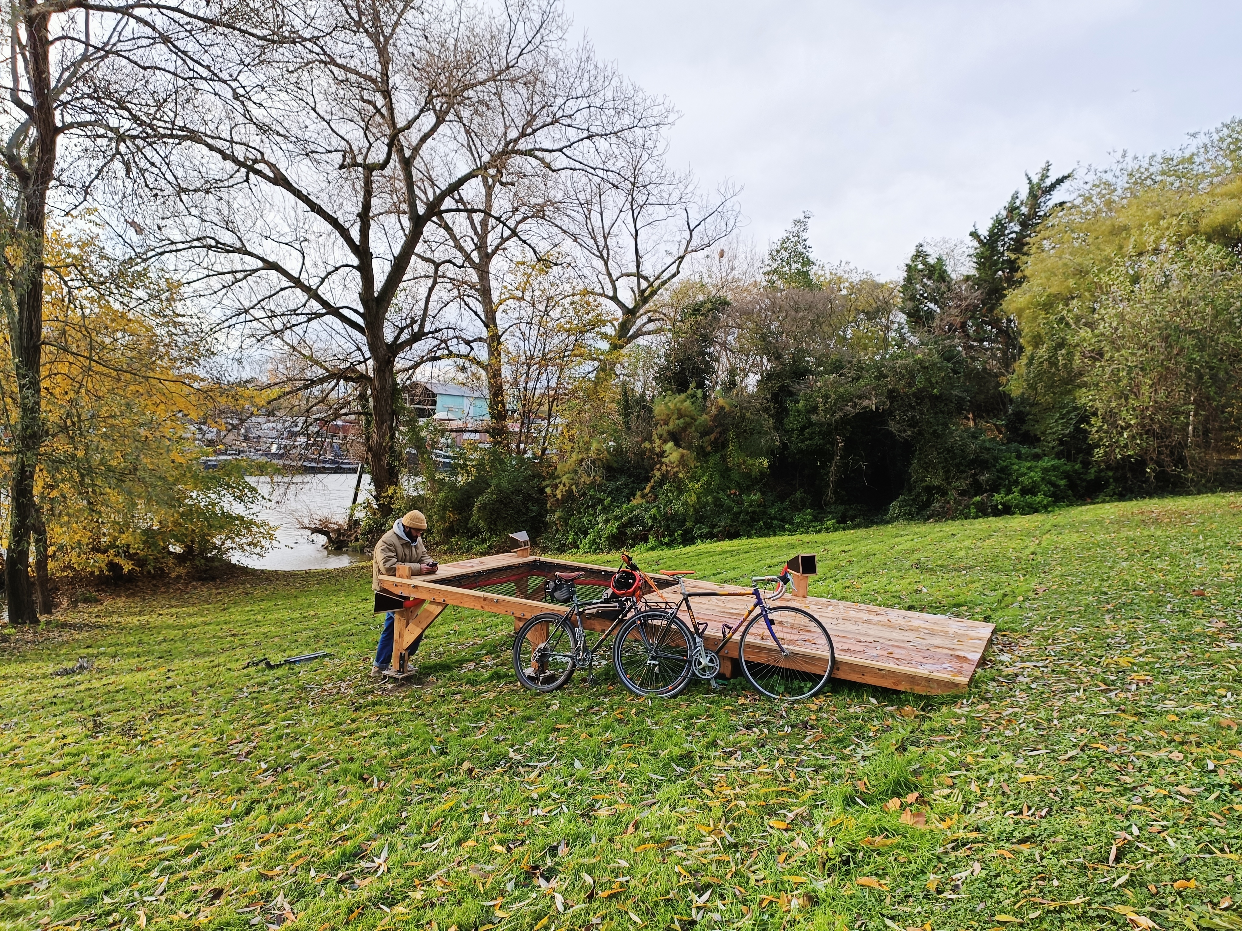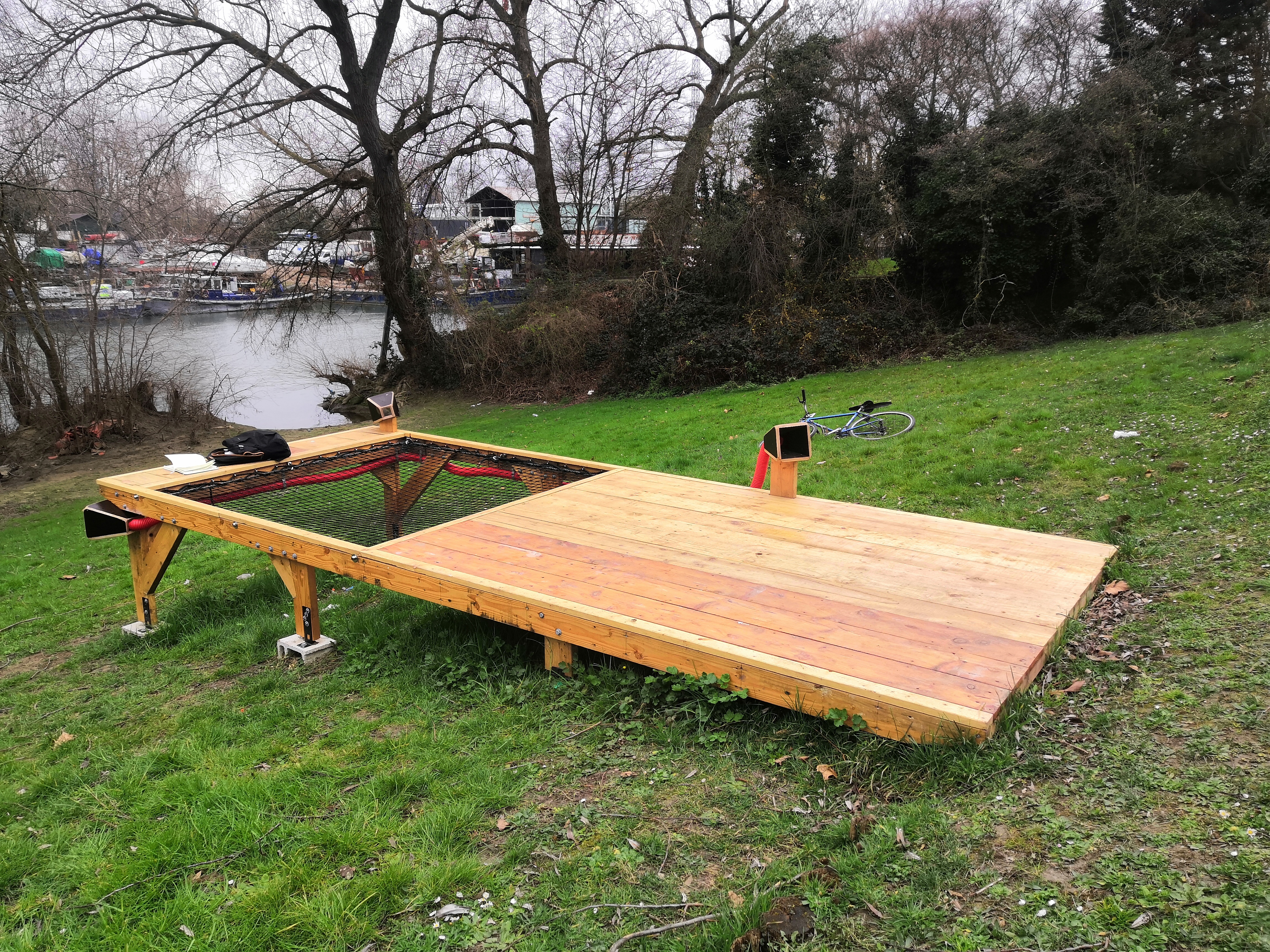 C’est dans le cadre du projet d’aménagement de la plage par les habitant.e.s du quartier, que nous sommes intervenu.e.s. Cette plateforme accueille un filet pour se poser, des espaces pour observer le paysage et des installations pour que les enfants jouent.