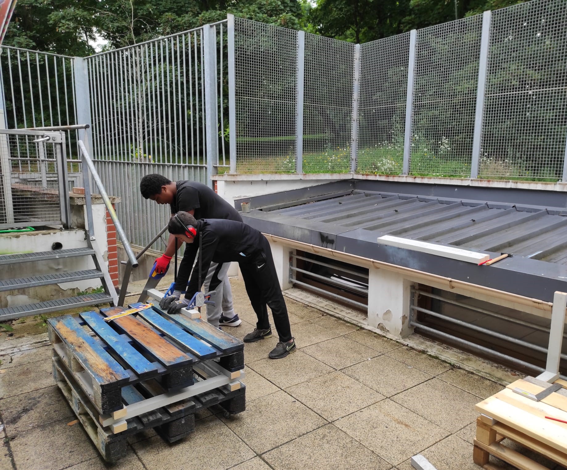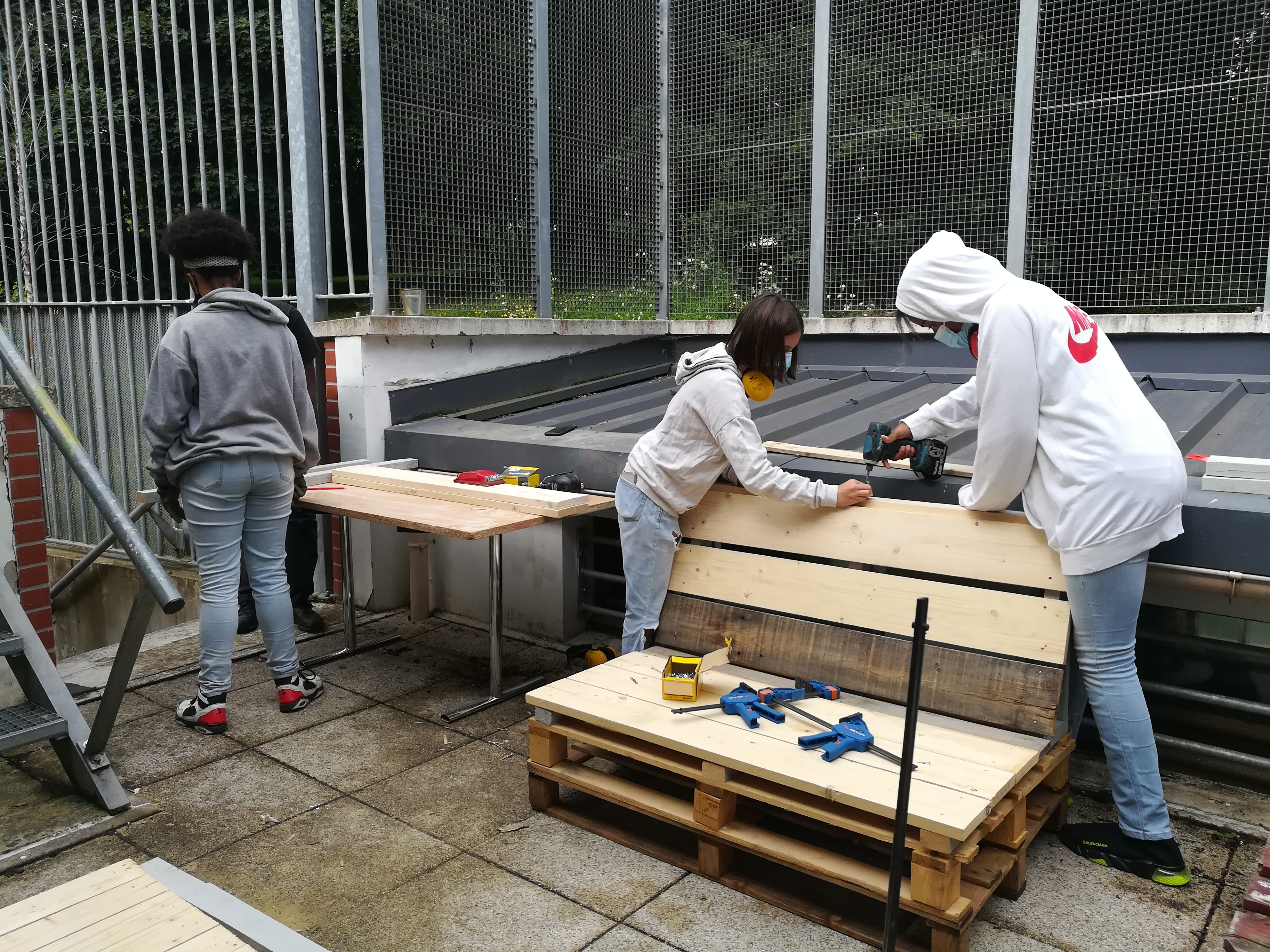 A la suite de rencontres dans le cadre du projet du Lycée Avant le Lycée, dans le quartier des Mathurins à Bagneux, un programme d’été au sein de l’Espace Jeunesse Marc Lanvin a été proposé aux adolescent.e.s curieux.ses d’apprendre à bricoler. Une série de mobiliers extérieurs-intérieurs ont été réalisés par de petits groupes afin d’aménager l’espace extérieur du “Club” et de s’approprier les espaces intérieurs pour l’automne/hiver. A l’occasion de cinq ateliers : trois tables, trois mobiliers d’assise et une estrade ont été réalisées avec 22 participant.e.s au total.