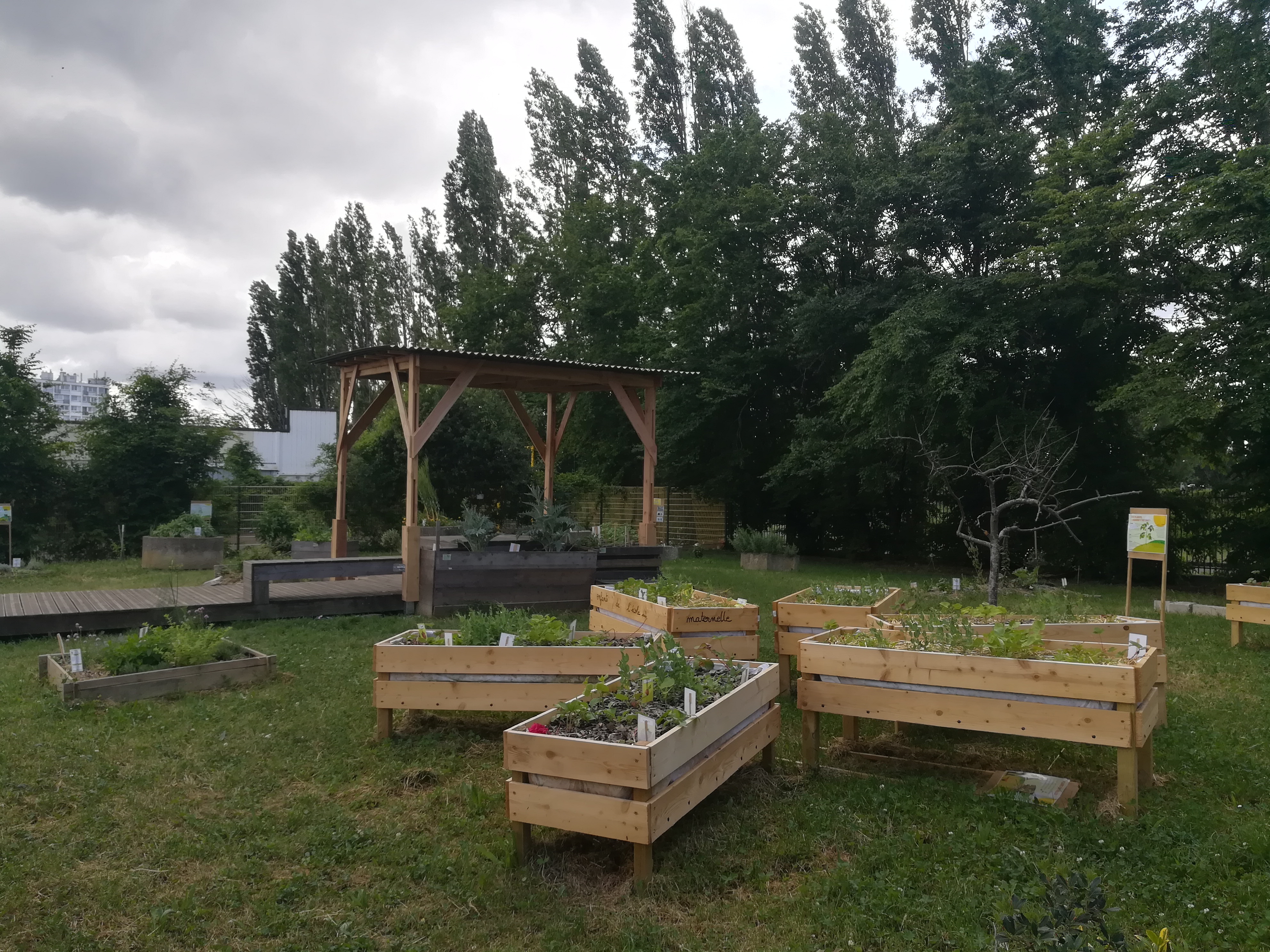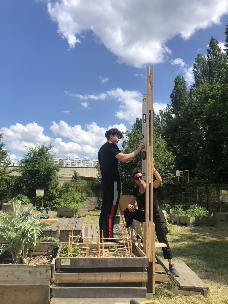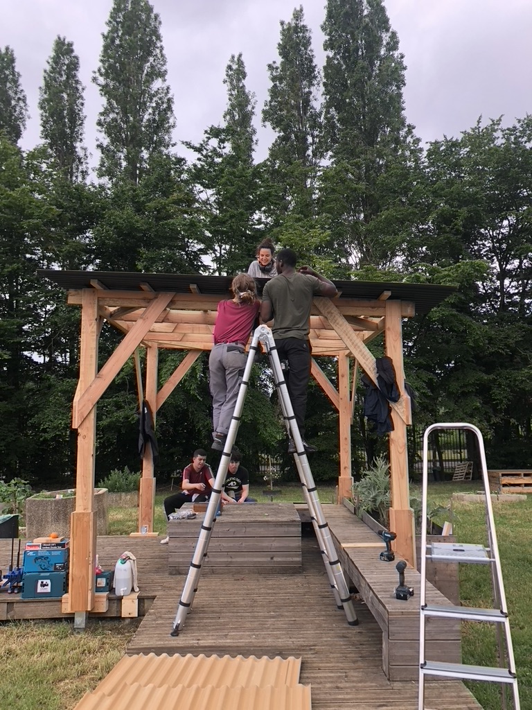 Ce projet est né du besoin des habitant.e.s de pouvoir s’ombrager ou s’abriter dans un espace qualitatif tout en profitant du cœur du jardin. Un chantier ouvert et apprenant a permis au collectif d’accueillir et de faire la rencontre d’Antonio et de Saber accompagnés par la SFMAD et la Mission Locale Saint-Denis Pierrefite.